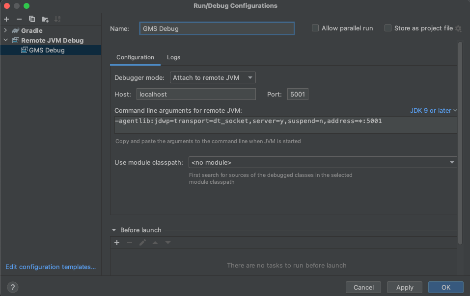 The screenshot shows an example configuration for IntelliJ using the default GMS debugging port of 5001.