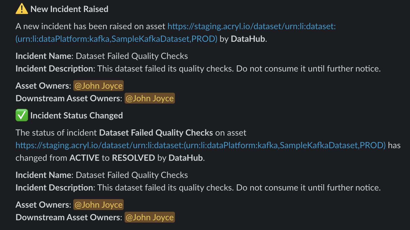 These notifications are also able to tag the immediate asset's owners, along with the owners of downstream assets consuming it.